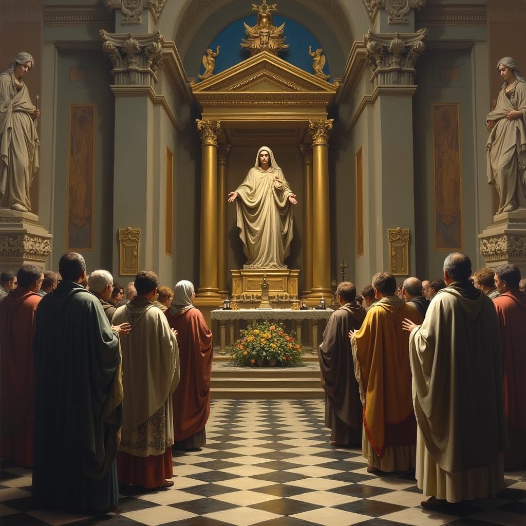 Uma pintura a óleo no estilo de Rafael Sanzio, retratando uma cerimônia em um salão majestoso, com um piso quadriculado em preto e branco e cadeiras de veludo azul. Ao fundo, um altar com velas acesas e uma imagem religiosa adornada com dourado. Homens e mulheres com vestes ricas estão presentes, observando ...