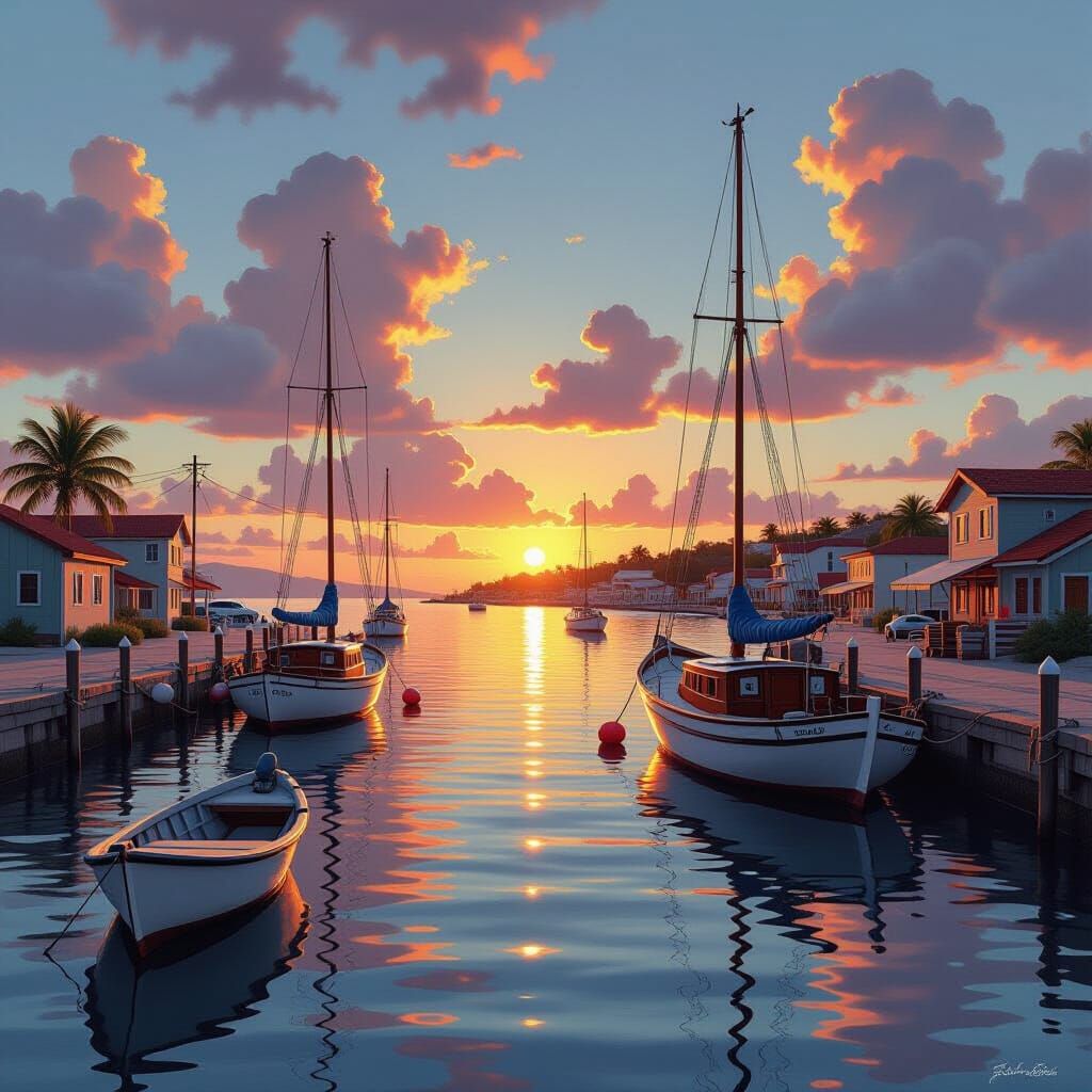 This image shows a vibrant Caribbean harbor scene at sunset. Sailboats and small fishing boats rest in the calm waters, rendered in a hyperrealistic style with warm colors and detailed textures.