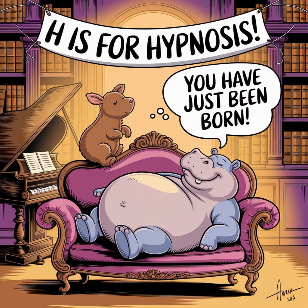 This image shows a whimsical illustration of a hippopotamus reclining on a couch, accompanied by a dassie chanting in bubble letters. An antique harpsichord sits nearby, with a banner overhead in a vintage illustration style.