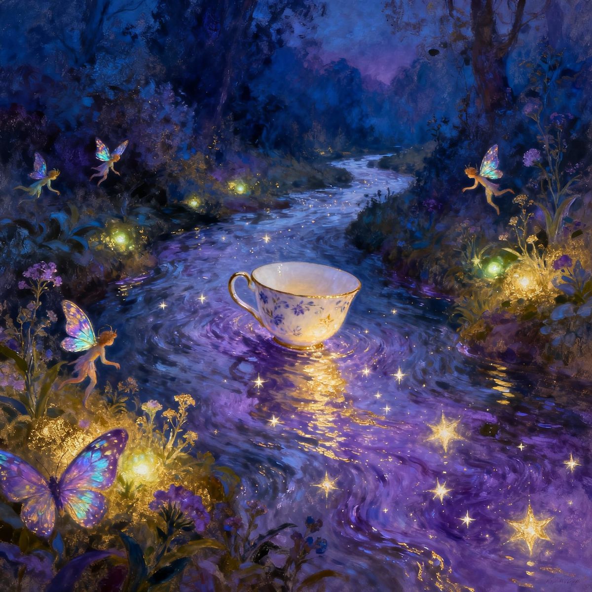 This dreamlike image shows a teacup floating on a river of starlight, with glowing plants on the banks. Rendered in a painterly impressionist style with luminous colors.