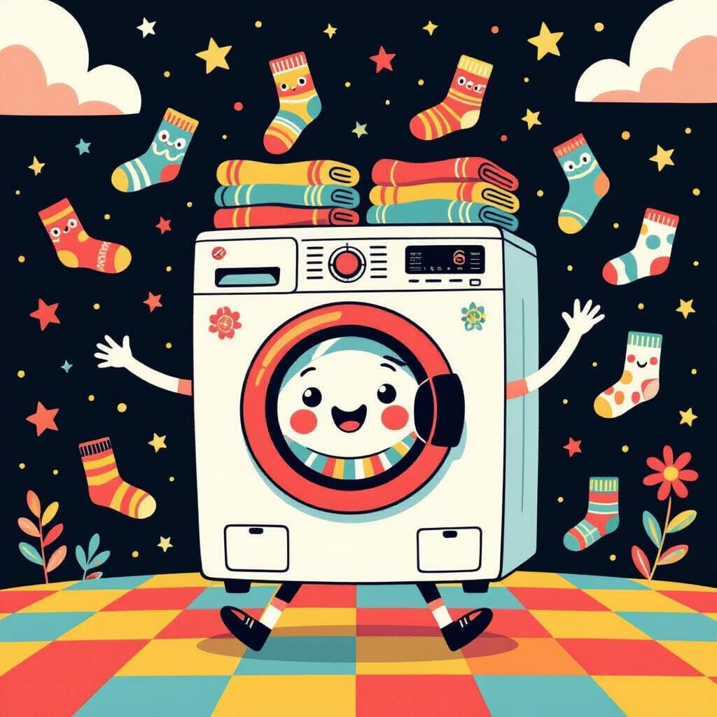 This image shows a whimsical washing machine come to life, dancing with socks and shirts in a flat, stylized scene. The image is full of playful energy with bold outlines, clean colors and cartoon-like style.