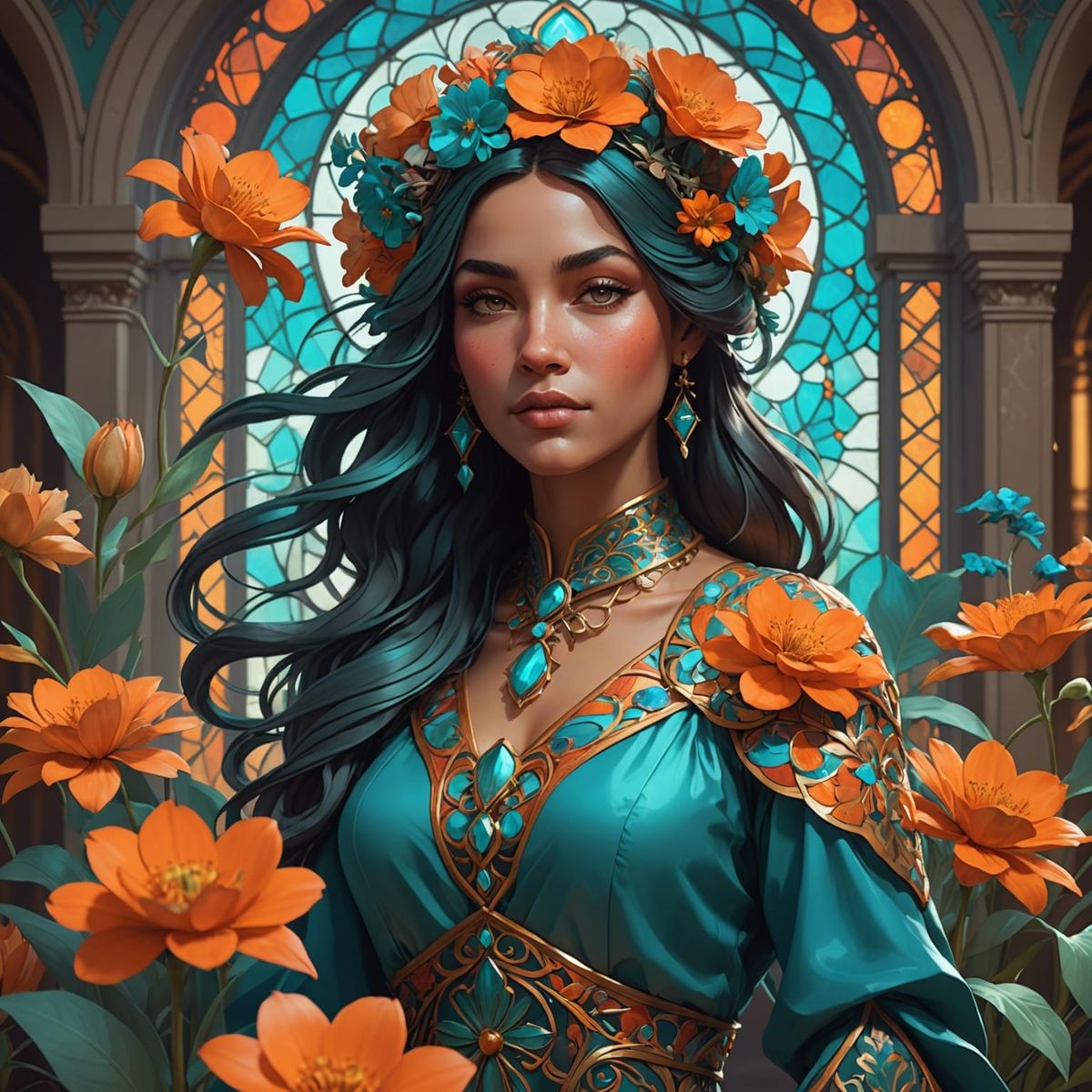 A vibrant, hyperdetailed digital painting of flowers in bloom. The image features dynamic lighting, volumetric effects, and triadic colors in a splash art style reminiscent of Art Nouveau.