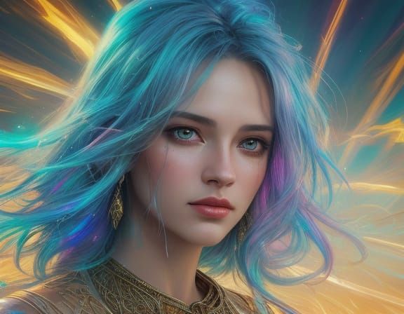 This image shows a person surrounded by shimmering light in an oil painting. The figure has an iridescent aura and is illuminated by soft golden lighting in a grunge art style.