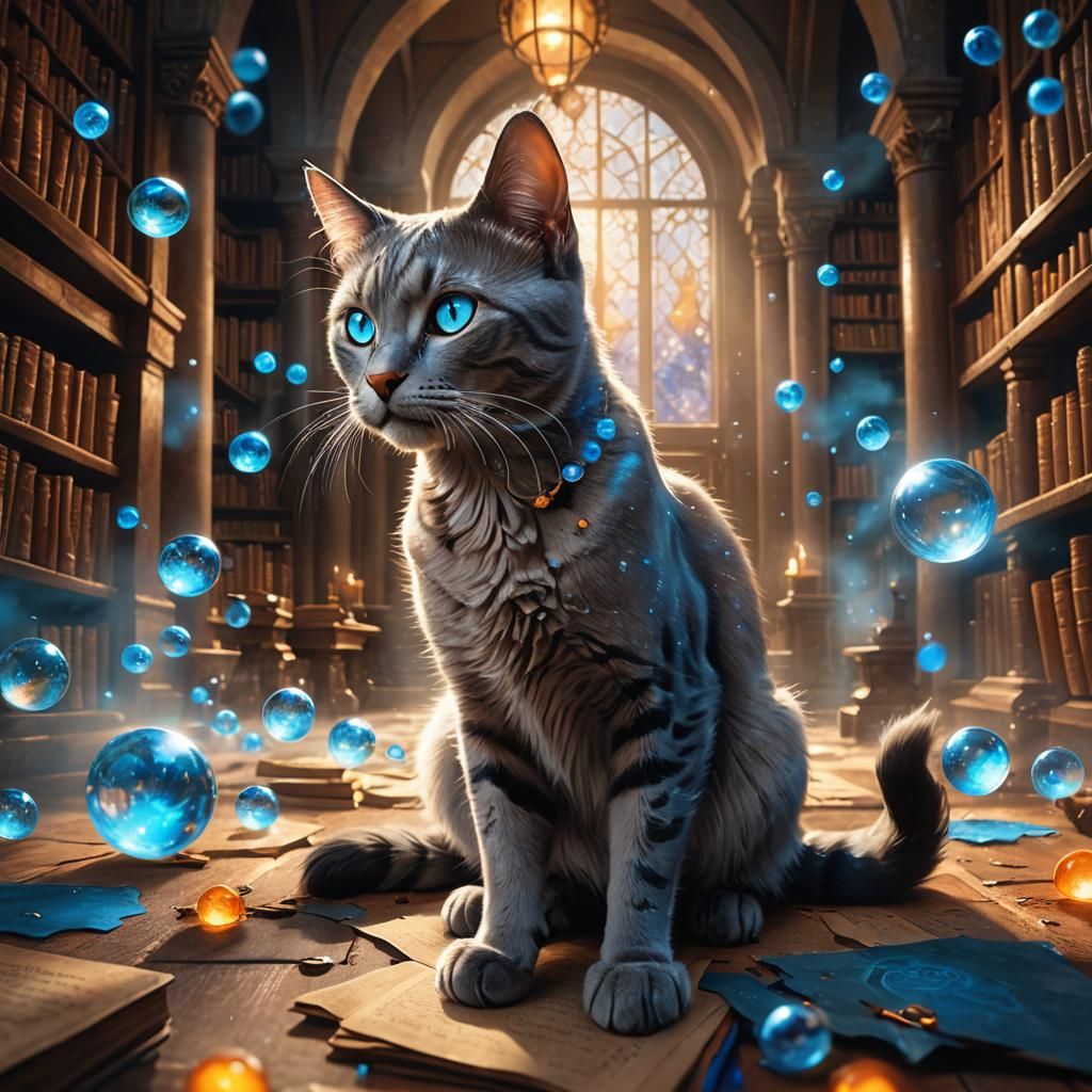 This image shows a grey and blue-eyed cat standing upright in an ancient library. The feline two-footologist has a scar and mystical aura in this vibrant, detailed matte painting inspired by Disney cartoon style.