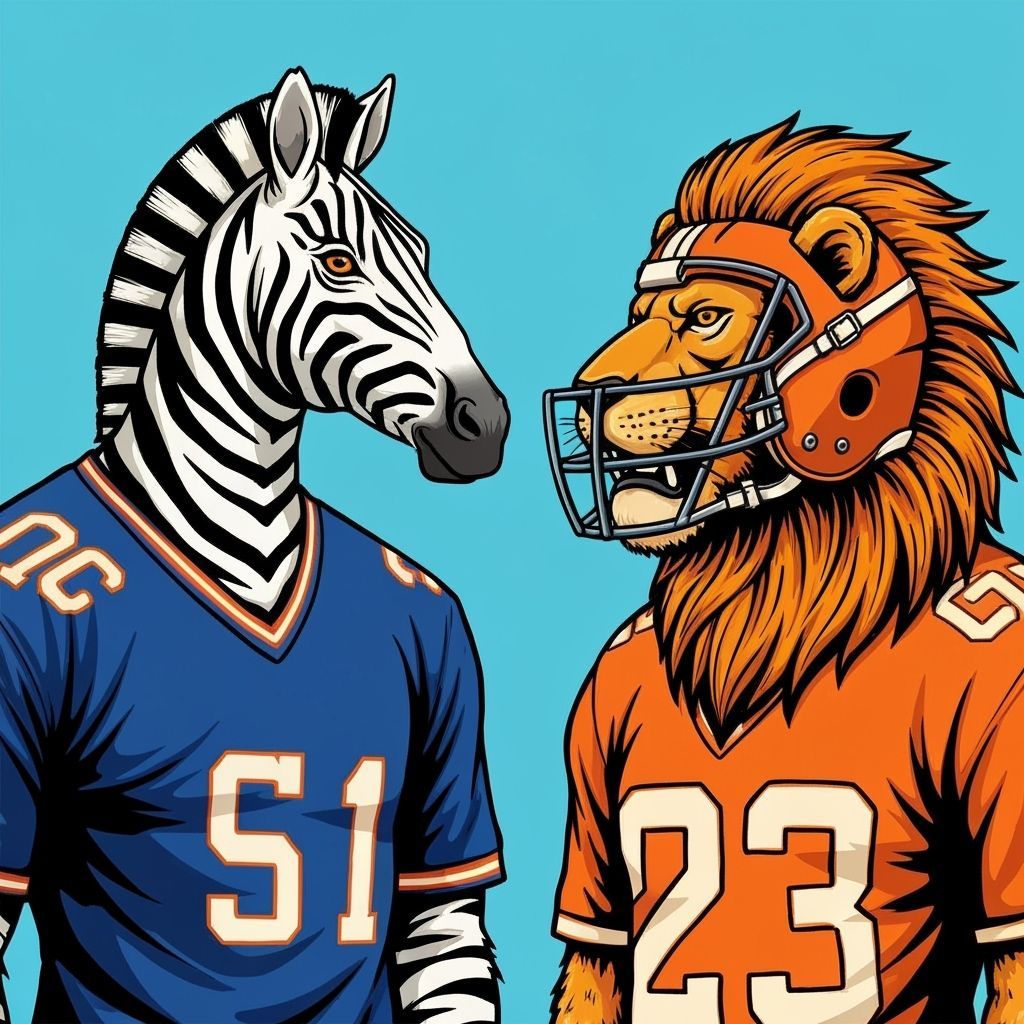 This vibrant graphic poster shows zebras in jerseys and lions in helmets facing off, featuring bold lines and bright colors inspired by modern illustration.