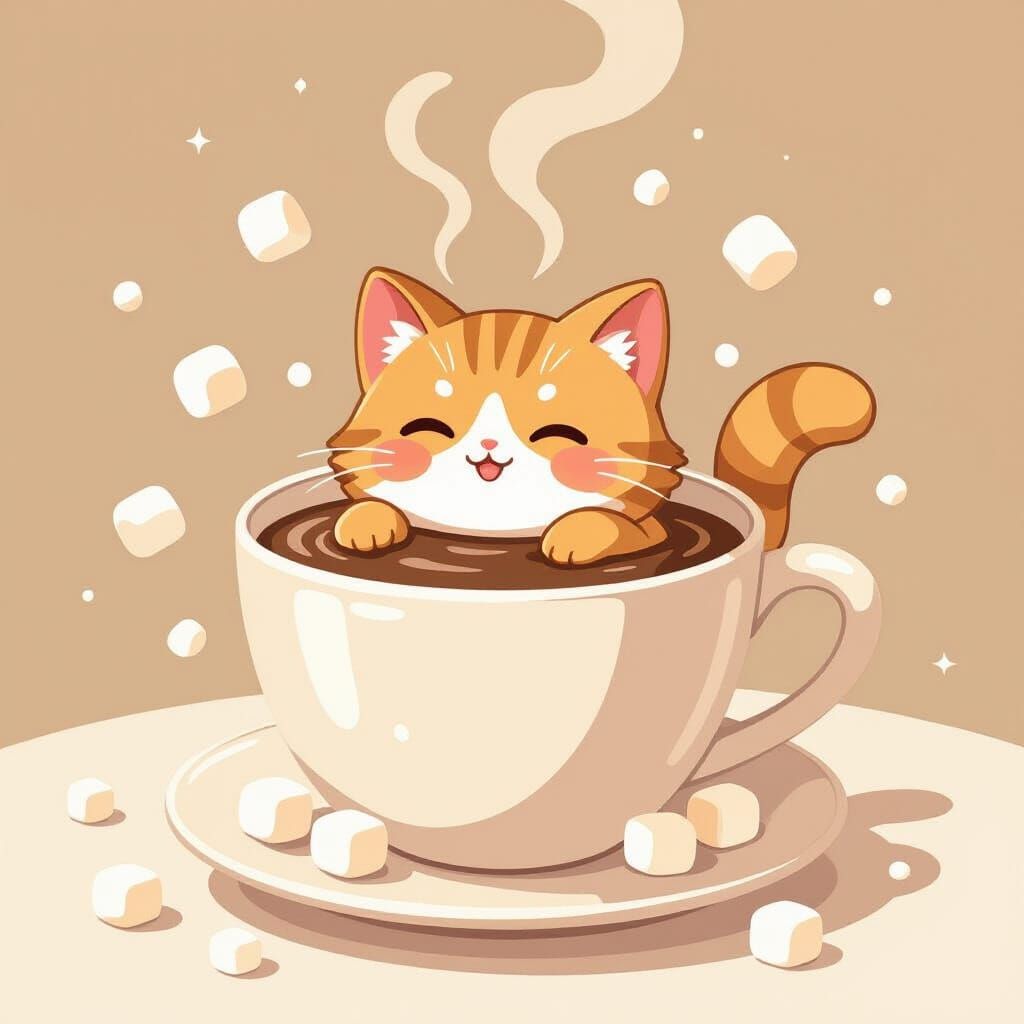 This image shows a fluffy ginger cat swimming in a steaming cup of hot cocoa with floating marshmallows. It features a warm, cozy atmosphere rendered in a kawaii art style with simple linework and soft pastel colors.