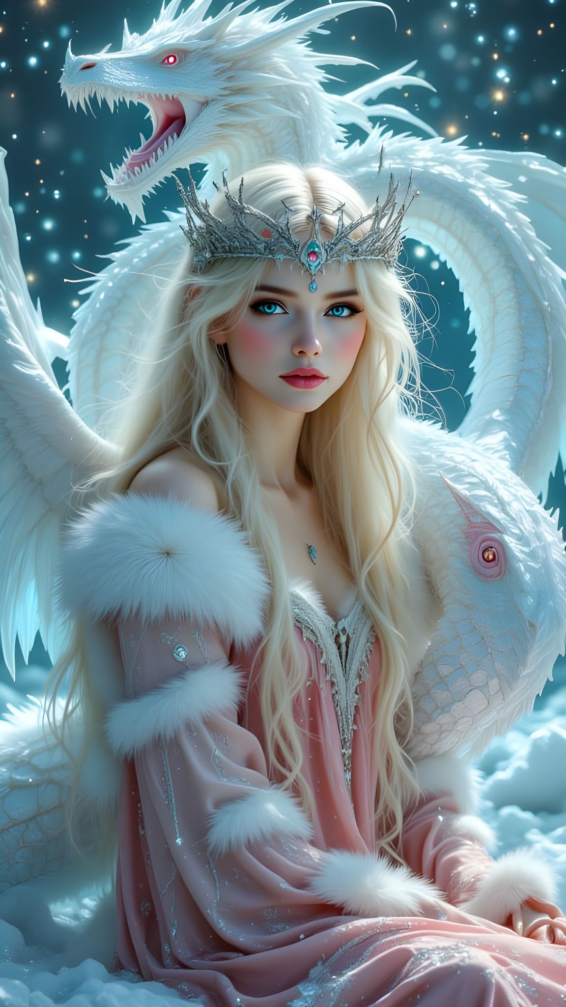 This image shows a delicate, ethereal princess with blonde hair and a silver crown, adorned in fur robes, trapped in a magical ice cavern. Ice sculptures of dragons surround her, rendered in a detailed, fantasy concept art style.
