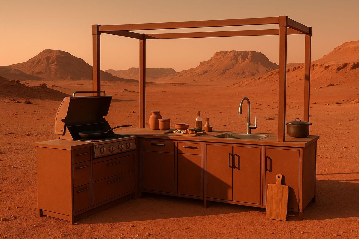 This image shows an outdoor kitchen situated on the planet Mars. The scene depicts a functional cooking space with the red planet's landscape in the background.