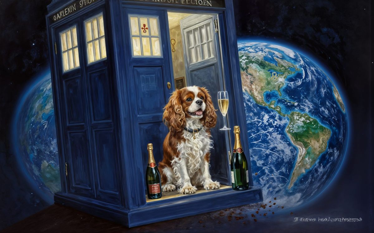 This image shows a Blenheim Cavalier King Charles spaniel portraying Doctor Who, sitting by his TARDIS in Earth's orbit. He joyfully toasts the planet with a glass of champagne. Rendered in a detailed oil painting style with dramatic lighting.