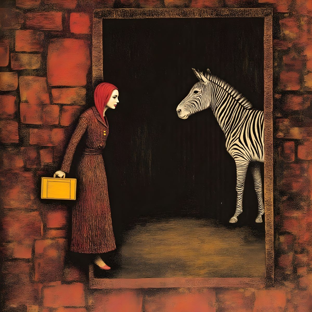 This image shows Bella, a detailed fox, and a zebra by an old theatre. Rendered in a colorful mixed media style with fine linework, reminiscent of Beatrix Potter and Arthur Rackham.
