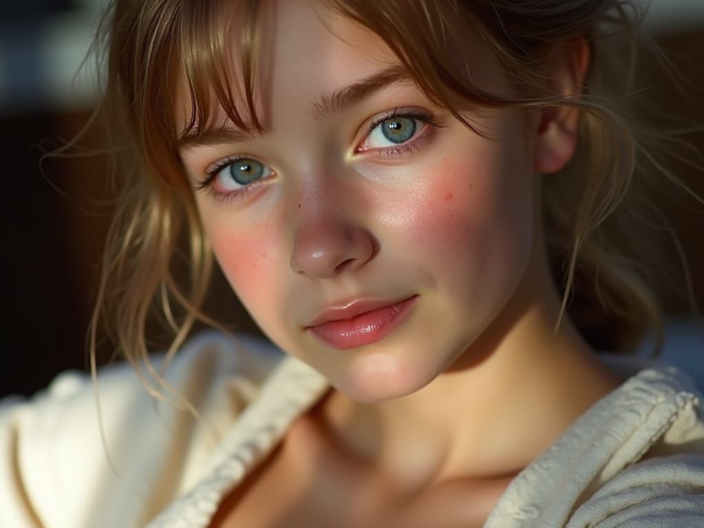 This image shows a close-up portrait of a young girl with tousled hair and flushed cheeks, wearing an off-white blouse. Warm golden hour light creates a soft glow, captured in a realistic, painterly style.