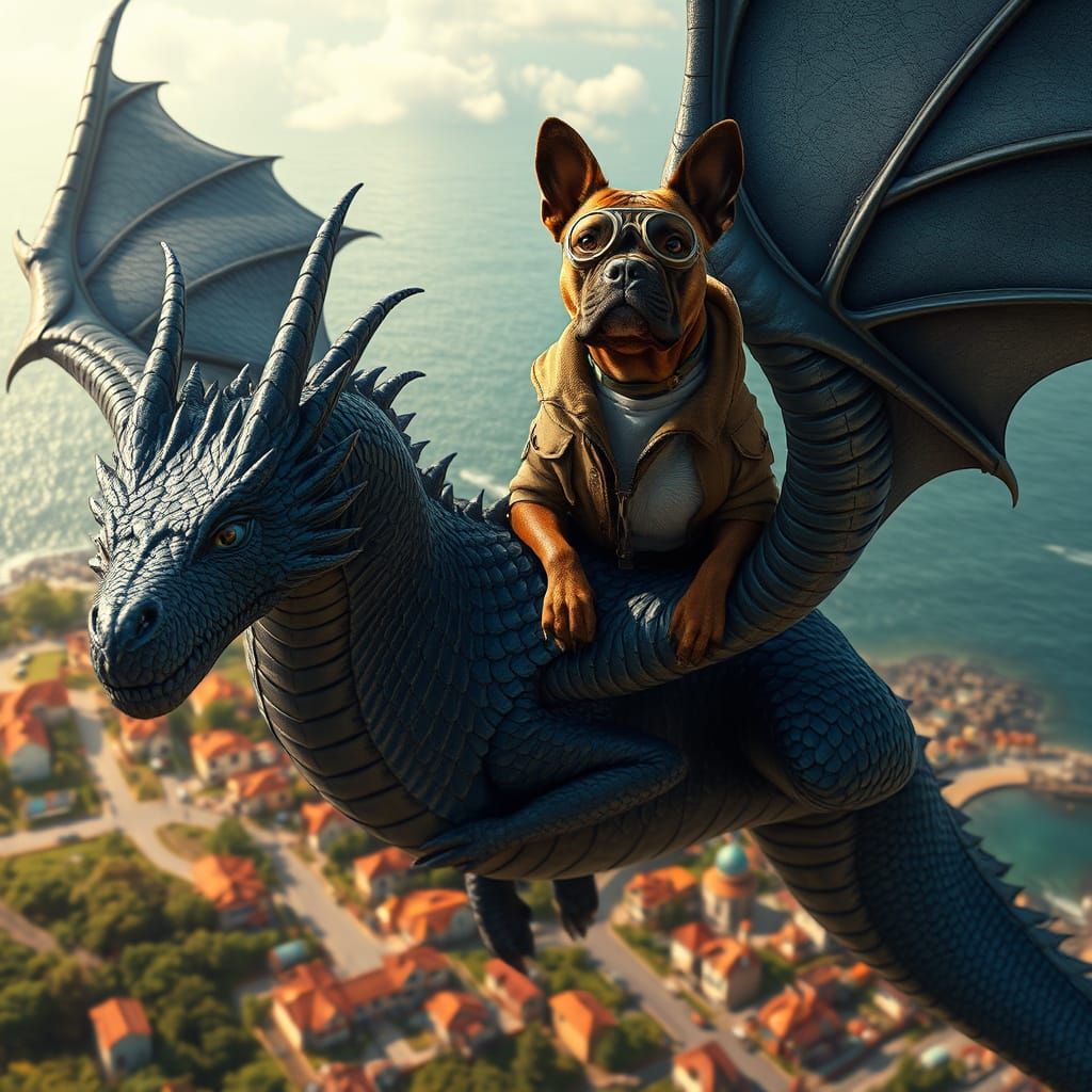 A stunning image of a majestic dark blue dragon soaring over a vibrant ocean town, accompanied by a spirited boxer dog in aviator gear, set against a dreamlike backdrop with intricate textures and dynamic colors