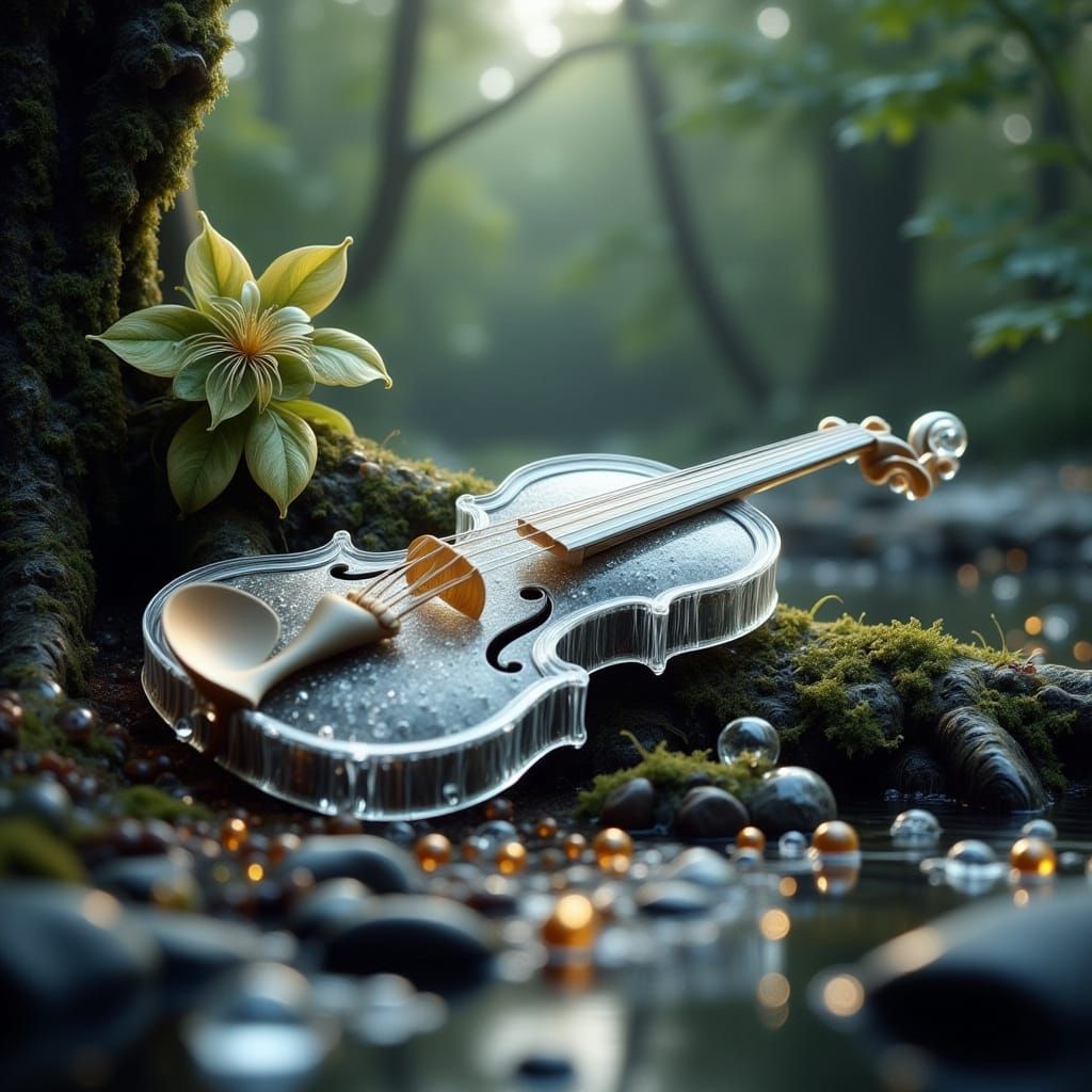 This captivating image features a violin submerged in a serene forest pool, surrounded by fairytale creatures and soft, dreamy light. The scene exudes a sense of magical enchantment.