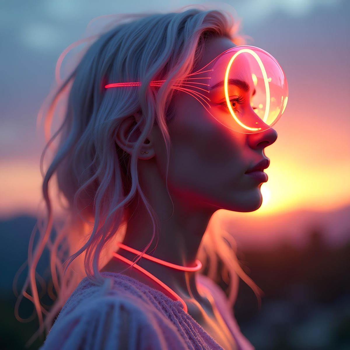 A hyperrealistic image of a woman with a neon eyeball headpiece, split between a bright, futuristic neon cityscape and a glowing sunset. The scene has an ethereal, dreamlike quality.