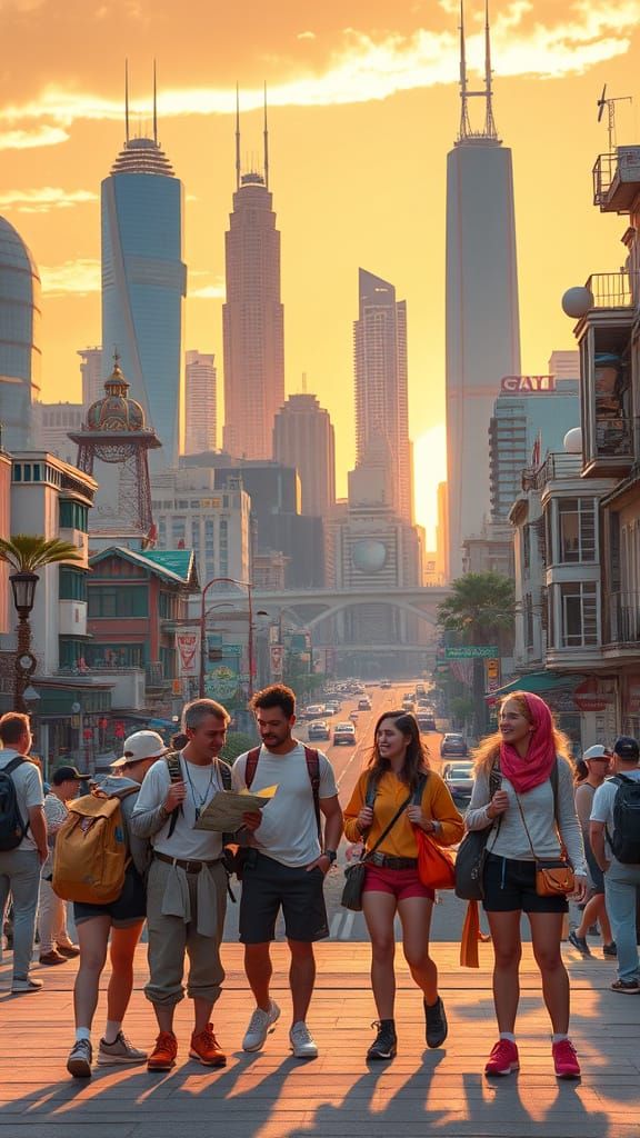 This image depicts a vibrant cityscape awash in the morning sun, showcasing eclectic skyscrapers and lively streets. Diverse people in adventure attire prepare for journeys with laughter and maps in a futuristic aesthetic.