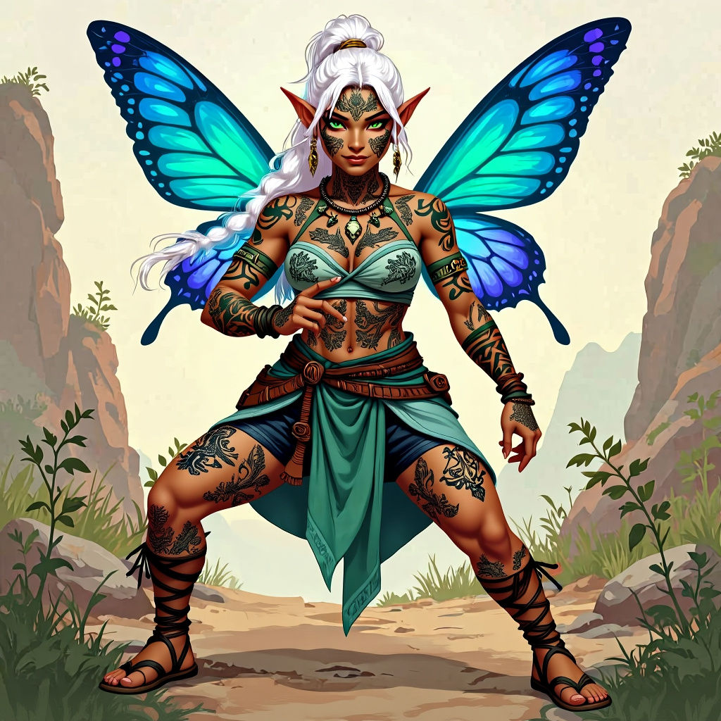 This image shows a female gnome monk with tribal tattoos and butterfly wings in a whimsical village. The gnome has an athletic build, fair skin, and bright green eyes, in a digital art style.