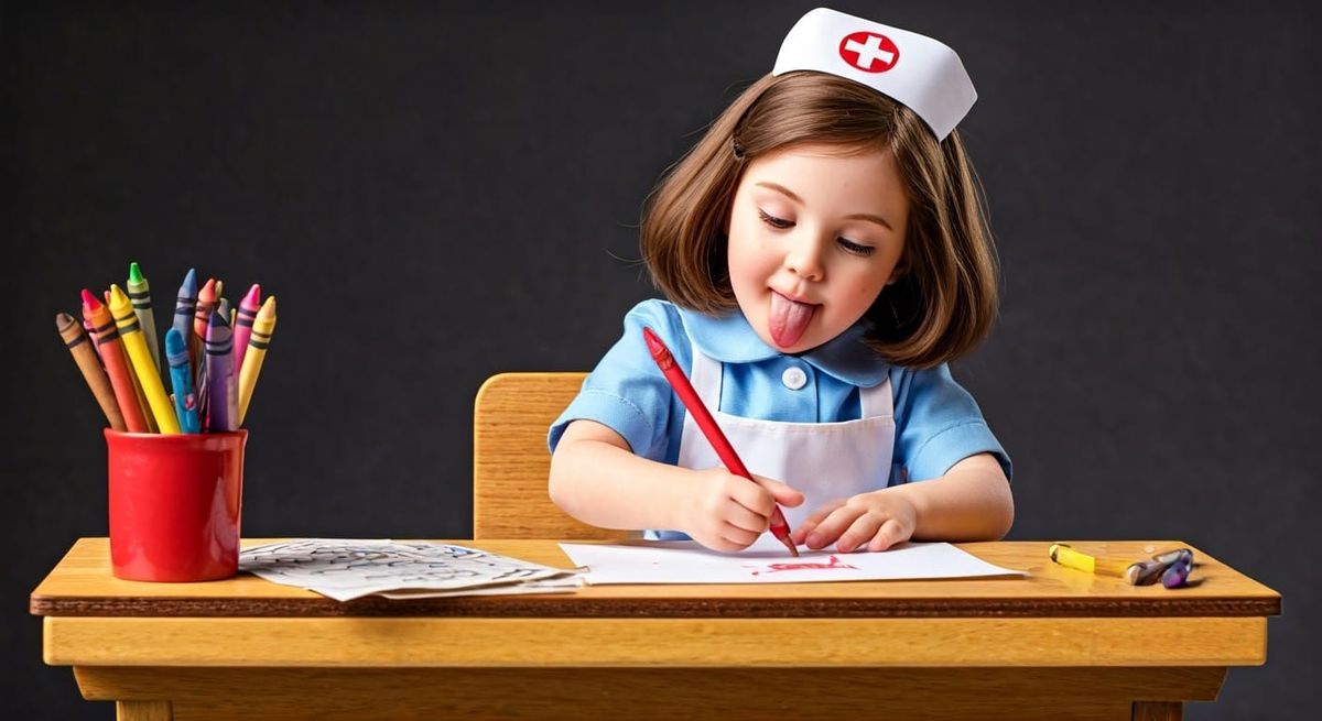 This image shows a young girl dressed as a nurse, drawing with a red crayon at a school desk. The illustration has a whimsical style with vibrant colors and playful textures.
