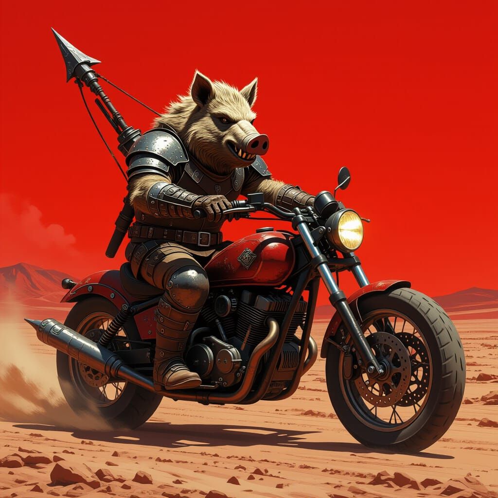 A striking picture of a wereboar warrior on a motorcycle in a desolate landscape. The image is imbued with a gritty aesthetic, resembling a cinematic film still with a dark color palette.