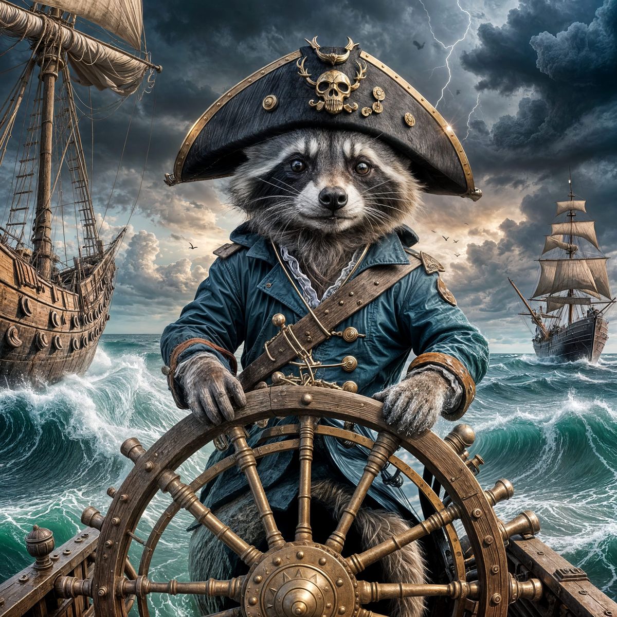 This image shows a raccoon captain steering a pirate ship through a storm. The scene is a detailed matte painting with deep colors, reminiscent of fantasy concept art.
