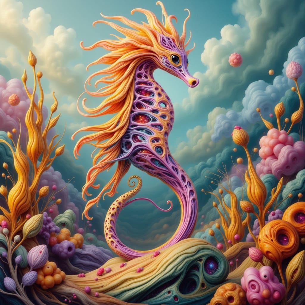 A vibrant image of a seahorse. The artwork is digitally enhanced with advanced AI techniques to create a visually appealing and modern aesthetic.