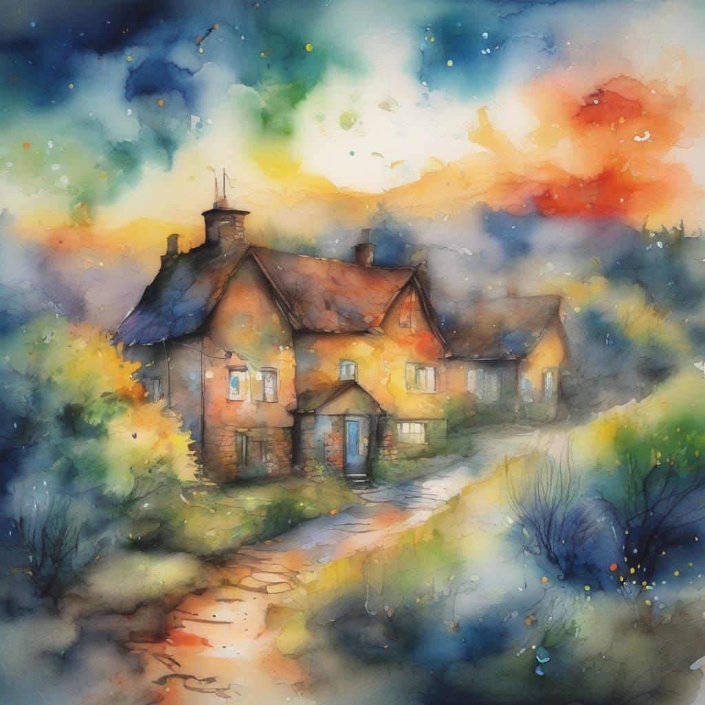 This enchanting watercolour painting depicts a 16th century fairy-tale village at dusk, with rustic stone cottages and cobbled streets. Vibrant tetradic colours dance across the scene, while glowing neon lights and ink splatters create a dreamy, ethereal atmosphere.