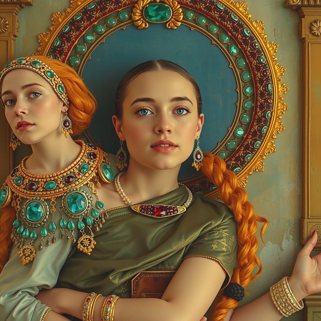 This image shows a regal portrait of a sovereign figure with striking blue eyes, adorned with emeralds and rubies. The artwork evokes a sumptuous, hypnotic Renaissance fantasy style.