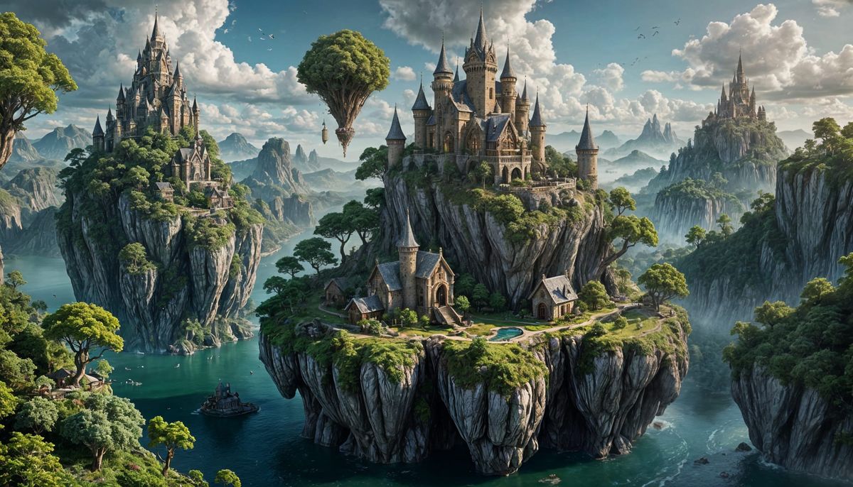 This image shows a fantastical floating island with an elven cottage resembling a castle, detailed as a matte painting with intricate detail and deep, complementary colors.