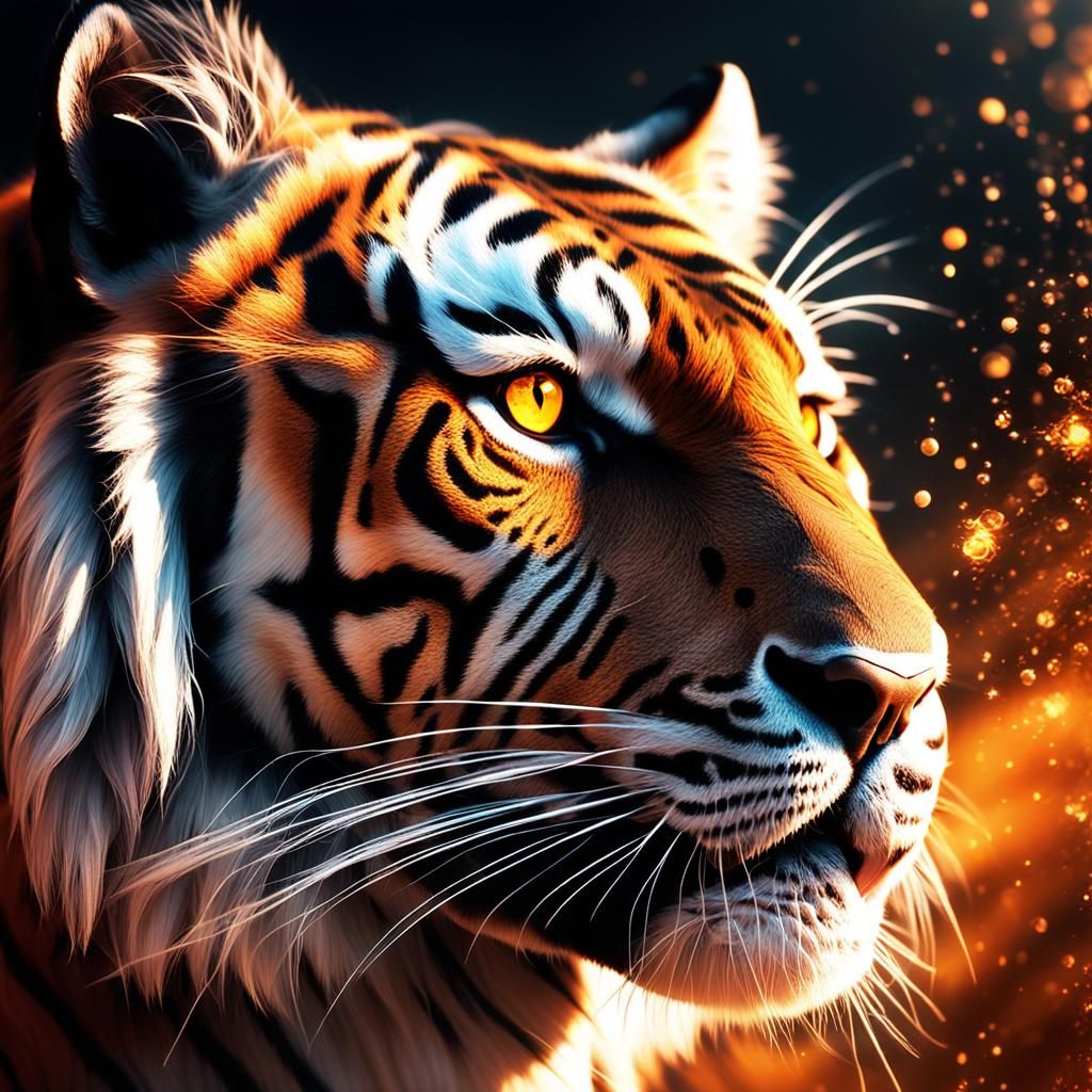 A close-up image of a tiger's eye reflecting sunlight. The digital painting features orange particles floating in the air, creating a warm and luminous atmosphere. The style is vibrant, detailed, and cinematic.