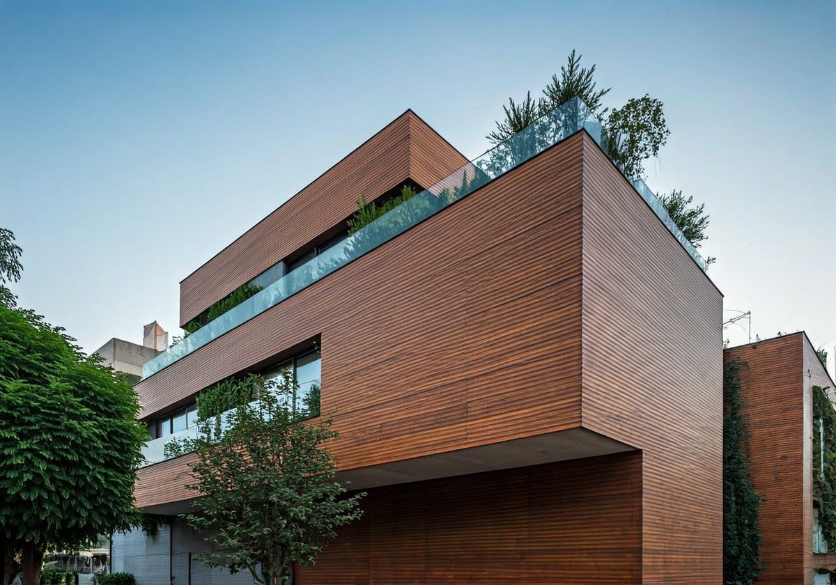 This image showcases a modern residential building with a subtle rooftop garden, inspired by the architectural styles of Mexico's Colonia del Valle and La Narvarte. The building features exposed concrete, warm wood, and glass, with a stepped facade, perimeter terraces, and balconies with greenery, large ...