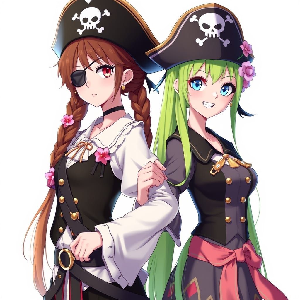 This image shows two anime-style pirate characters, Koboyashi and Sakura, linking arms. Sakura has long brown braided hair with cherry blossoms. Koboyashi has long lime green hair in pigtails and wears a pirate hat.