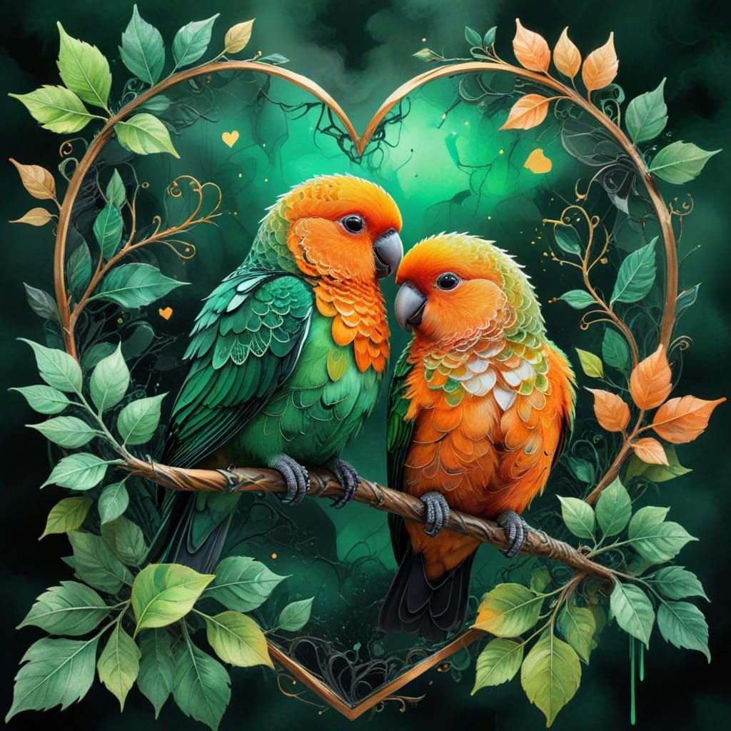 This image shows two lovebirds resting on a shattered heart surrounded by leaves. The 3D artwork features neon orange and green colors, glowing swirls, geometric shapes, and golden highlights in a watercolor style.
