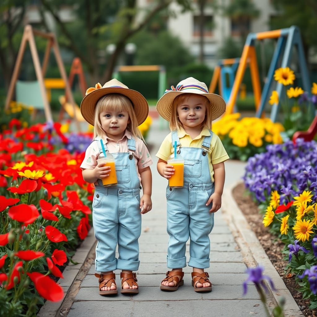 This image captures the joy of childhood as two identical twin girls stand amidst a whimsical urban garden, surrounded by vibrant flowers and playful equipment, their faces aglow with curiosity and delight.