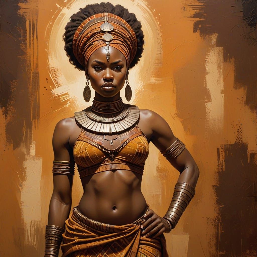 This image shows a powerful African female warrior with a confident expression, surrounded by intricate traditional patterns and warm golden lighting, as rendered in a beautiful earth tone painting style.