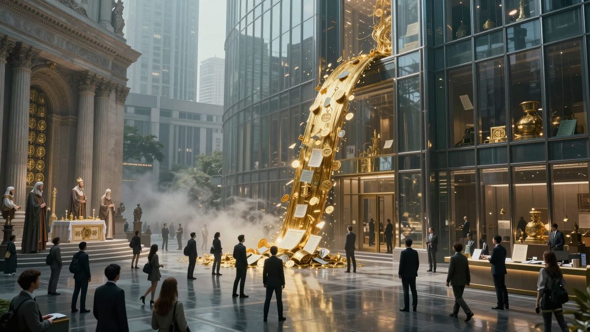 This image shows a dystopian scene depicting the evolution of religious institutions into modern financial empires. Ultra-realistic cinematic style with a focus on cold, metallic light and deep shadows.