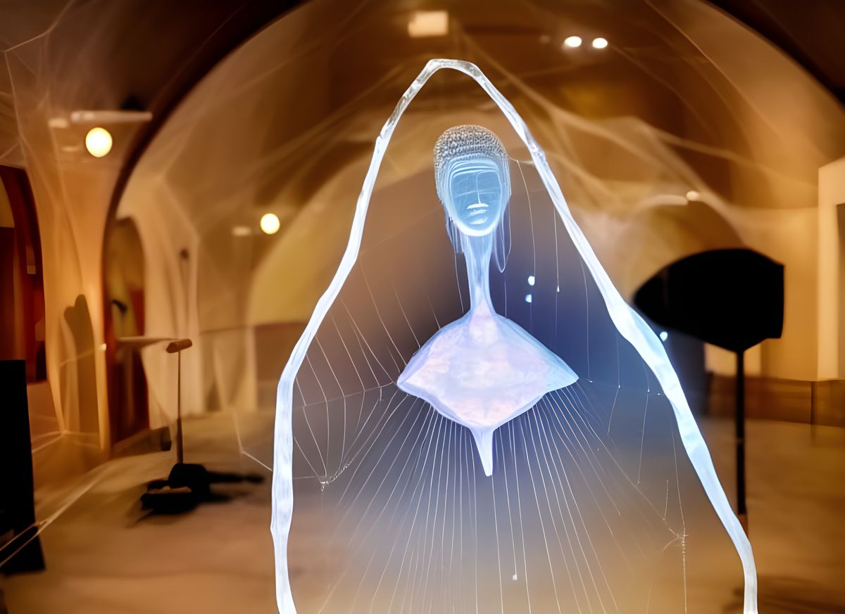 Human sized Crystal Sculpture of a person at the core but expanding out into finer and finer features filagree gossamer spider web opalescence magical particles particle system is dreamy celestial spectral god rays subsurface scattering chromatic aberration striking hyper real painting surreal silver ...