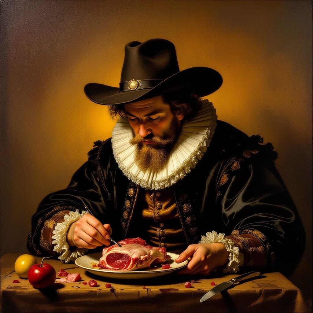 This oil painting depicts a majestic lynx eating prey, bathed in soft golden light. Rich colors and textured brushstrokes create a dramatic, raw realism.