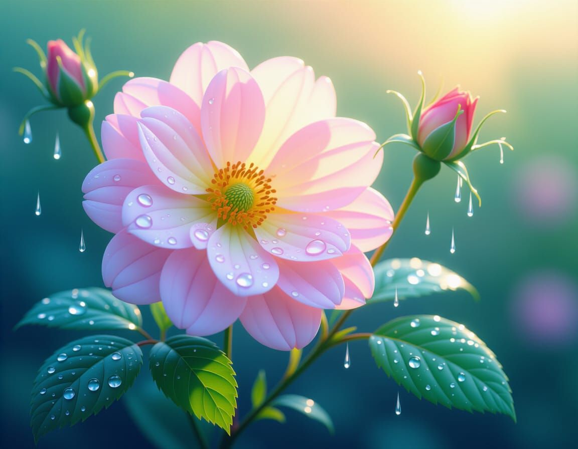 This image shows a rose on a stem at sunset, with raindrops on its petals and leaves. The piece is rendered in romantic style with pastel colors and hyperdetailed features, reminiscent of concept art.