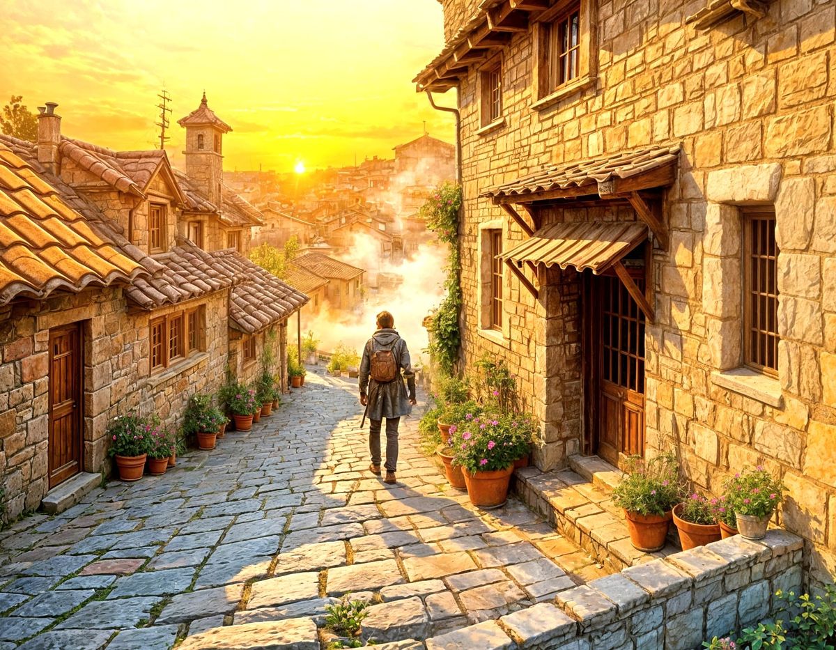 This image shows a steaming cup of coffee on a rustic stone wall against a fairytale sunset backdrop. The artwork evokes a watercolor painting with rough textures and dramatic lighting.