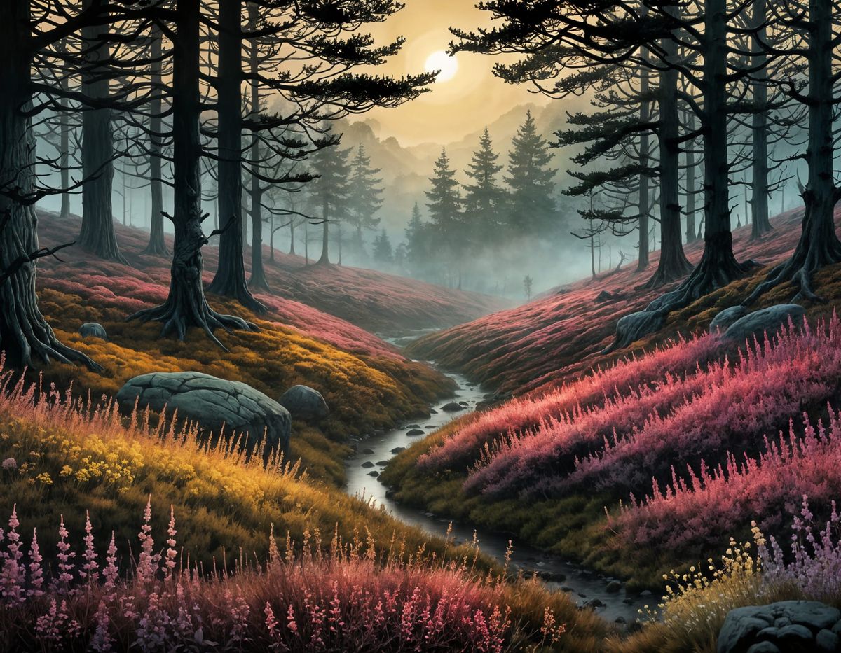 A captivating image of heather in bloom shrouded in morning mist. The scene is rendered with meticulous detail and intricate linework, reminiscent of comic art.