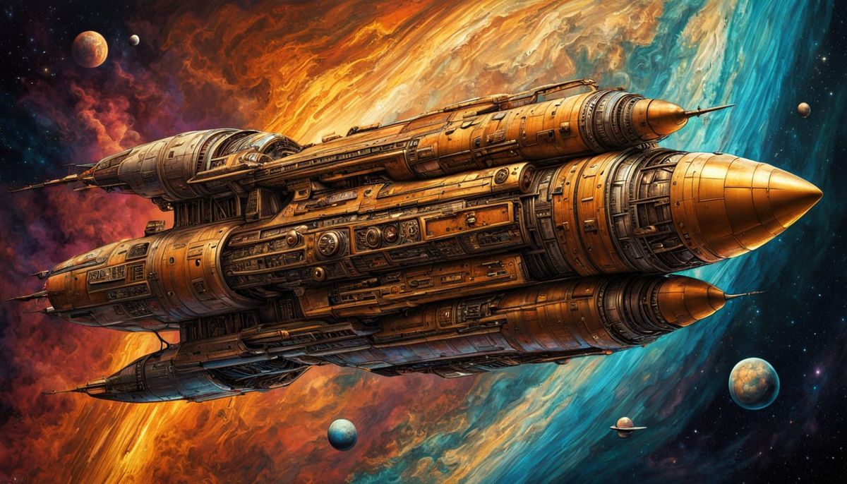 This Renaissance-style oil painting depicts a worn, old sci-fi human transport rocket soaring through the colorful cosmos, with the stars of the Milky Way shining brightly overhead. Characterized by thick, textured brushstrokes and warm, golden lighting, this masterpiece showcases a vintage sci-fi aesthe...