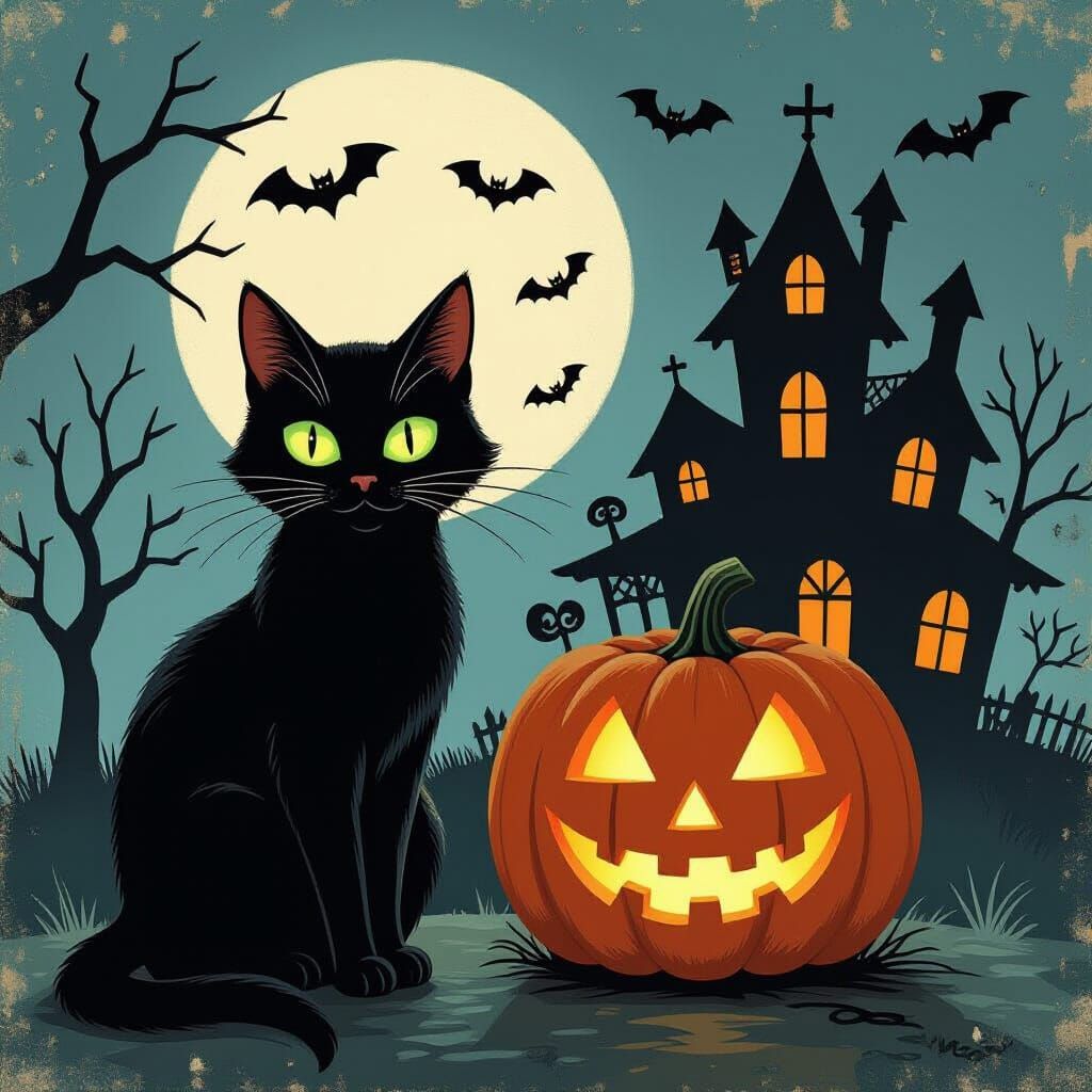 This image depicts a vintage, scary Halloween card with a black cat, jack-o'-lantern, and haunted house. Rendered in a gothic art style with dramatic lighting for an unsettling mood.