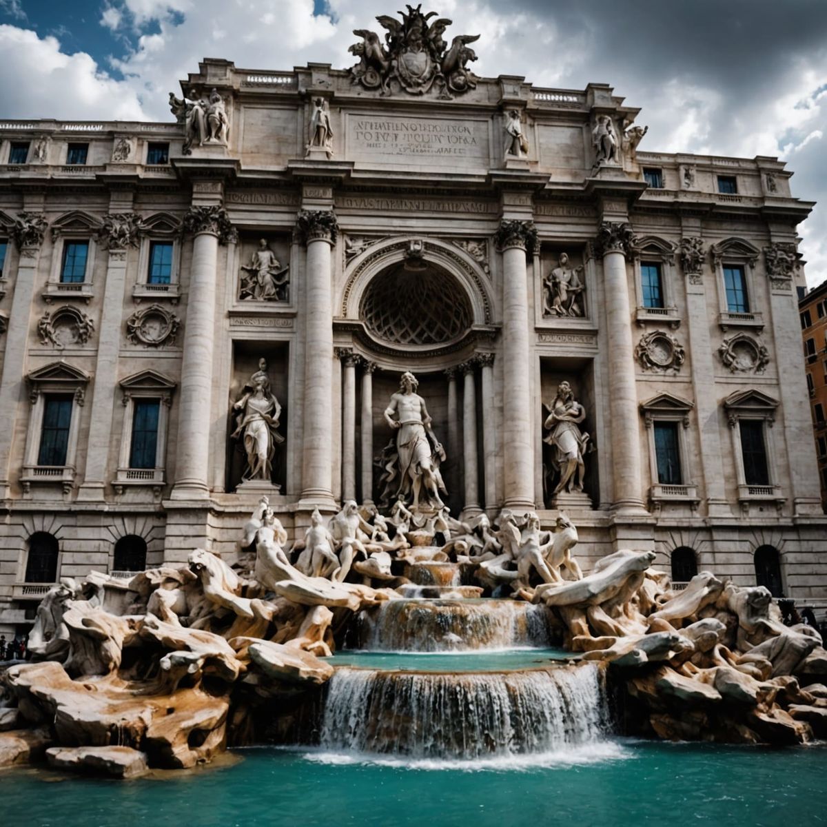 This image shows the Trevi Fountain with intricate details and sharp focus. The high-contrast picture has a cinematic and atmospheric aesthetic.