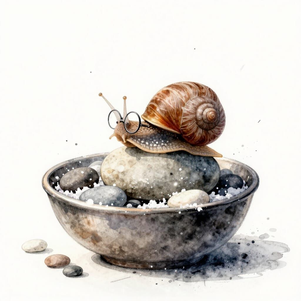 This image depicts a whimsical snail wearing glasses, paused on a pebble within a diorama. Snow-soft watercolor flakes drift around it, creating a serene, contemplative scene in a unique artistic style.
