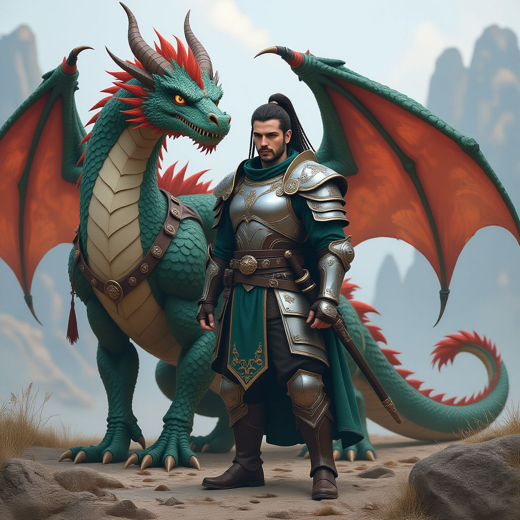 A detailed image of a majestic dragon with bridle and harness, standing beside its armored rider. The artwork features dynamic lighting, intricate details, and vibrant triadic colors. The style is reminiscent of anime and 3D art.
