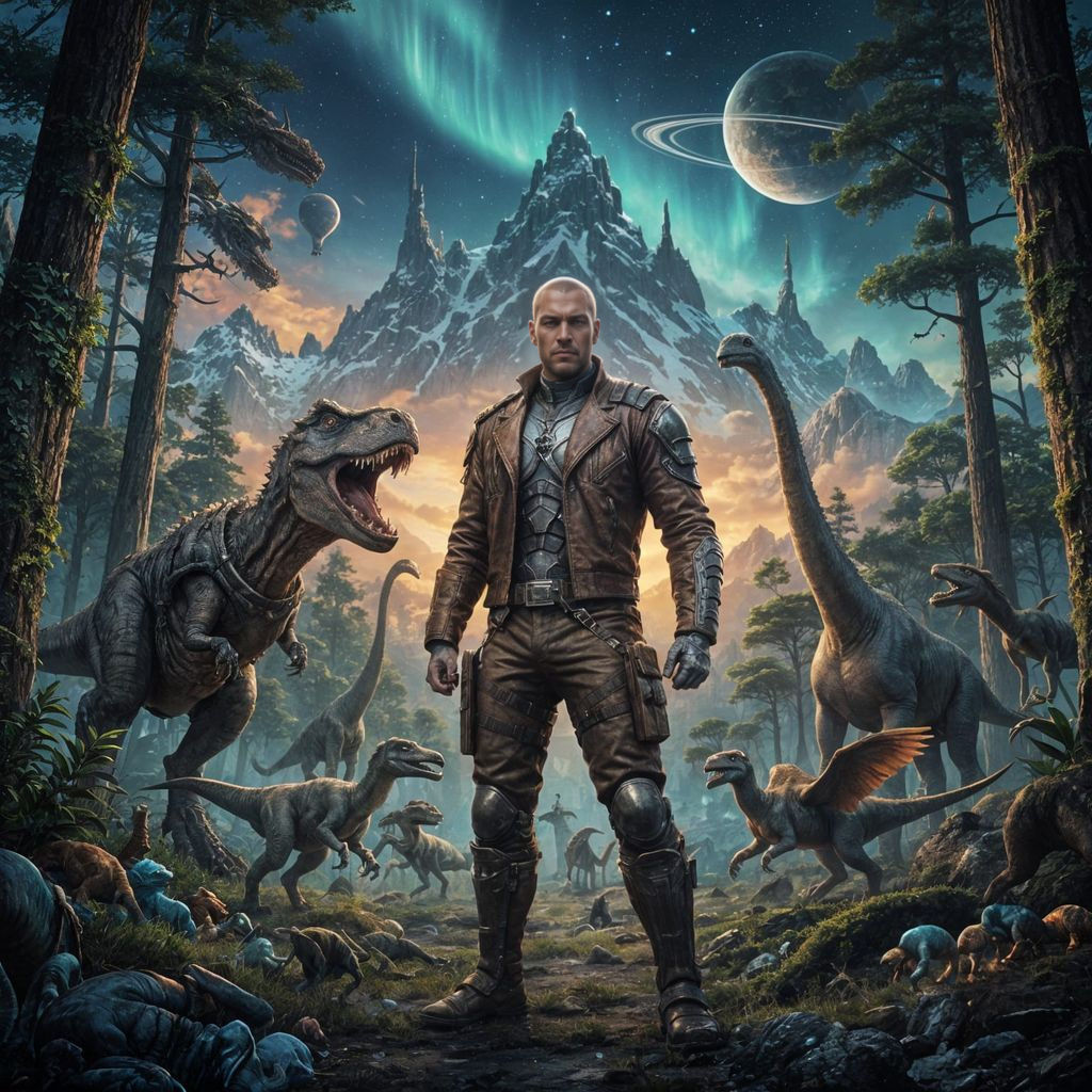 This striking image depicts a high-fantasy sci-fi cyborg in a detailed ancient setting with dinosaurs. Captured in a cinematic style with dramatic lighting and film grain.