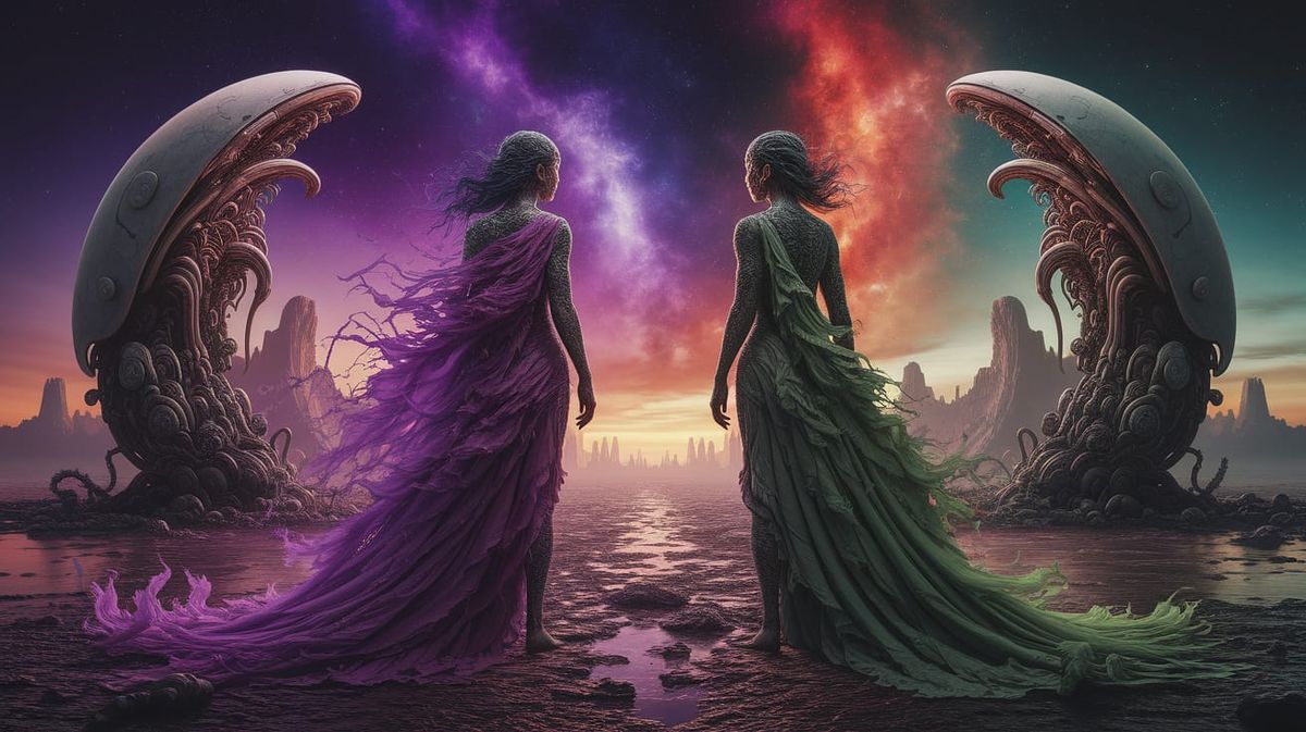 This image shows a desolate dreamscape with dual, androgynous figures standing at the edge, surrounded by twisted ruins and a vivid, fiery sky, blending science fiction and mysticism in a surreal, impasto style.