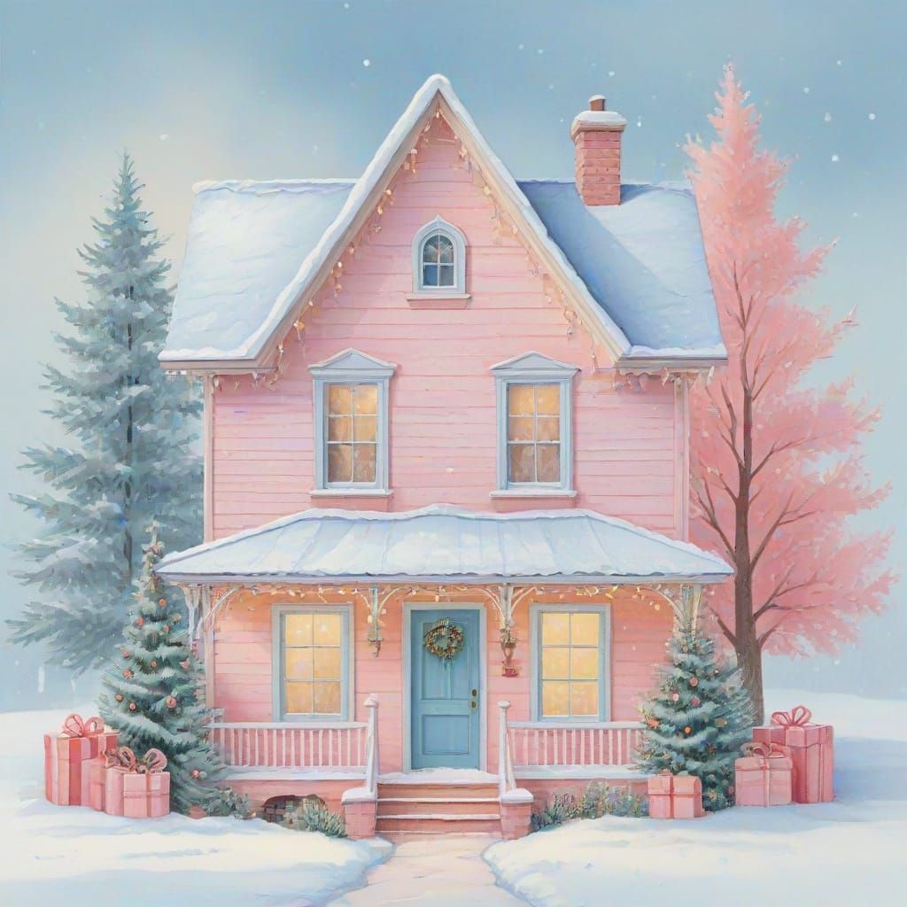 This image shows a charming two-story pink house with a snow-covered roof and a decorated Christmas tree. It is rendered in a watercolor illustration style with gentle washes of color.