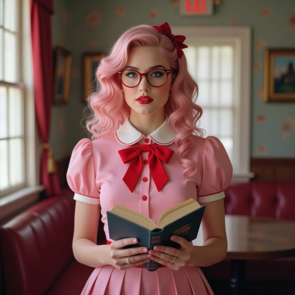 This image shows a nerdy girl with pink curly hair and glasses, wearing a pink uniform and holding a book. The aesthetic is reminiscent of live-action film stills with cinematic lighting and a 35mm film aesthetic.