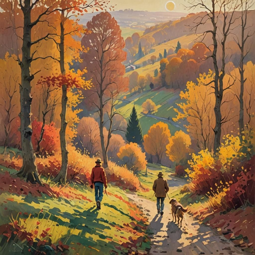 A vibrant impressionist painting of a person walking their dog in an autumn landscape. The scene is bathed in the warm light of golden hour, with long shadows and blended colors.
