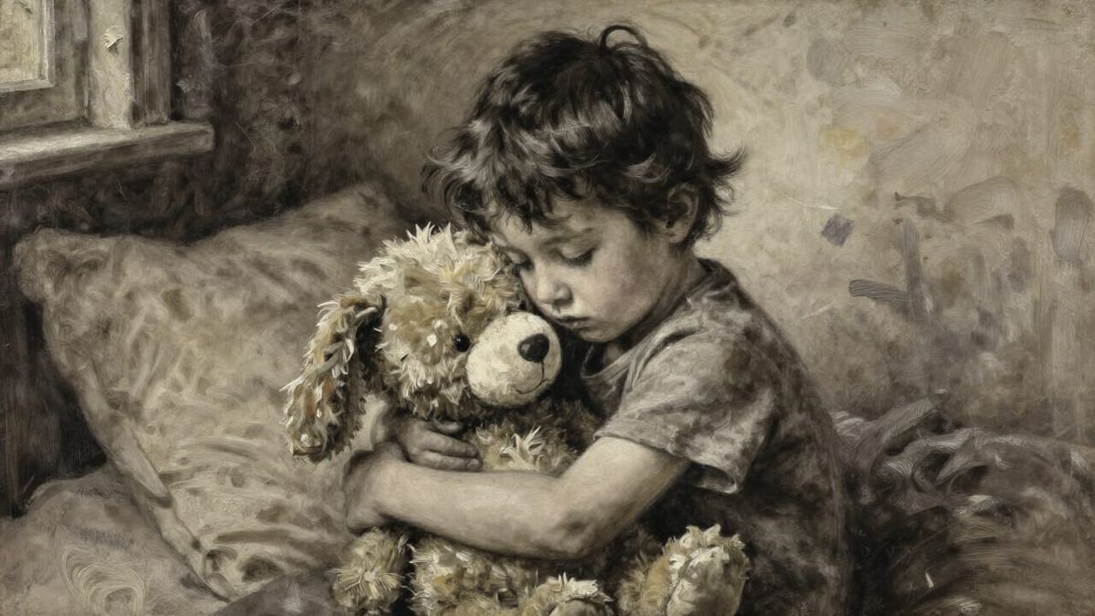 This image depicts a child embracing a cherished stuffed animal, bathed in the soft, nostalgic glow of bedroom light. Rendered with thick, textured brush strokes in gouache and watercolor, it captures a moment of pure comfort.
